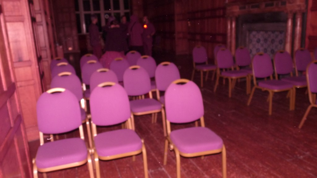 Orb C can be seen above the group of people gathered at the top of the image and Orb D (much smaller) can be seen in the aisle between the rows of chairs, at about the 2nd row from the front. All of these are in different places on the photo frame so are unlikely to be dust on the lense. the group at the top of this last photograph were engaged in a table tipping exercise.